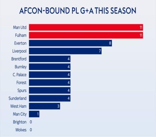 2025非洲杯本周末将拉开帷幕,参加这届赛事的英超球员已经前往各自的国家队报到,被征召的球员最多可能缺席一个多月。那么,哪些英超俱乐部受到的影响最大,哪些俱乐部受到的影响最小呢?